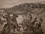 [5.18] Caesar, discovering their design, leads his army into the territories of Cassivellaunus to the river Thames; which river can be forded in one place only and that with difficulty. When he had arrived there, he perceives that numerous forces of the enemy were marshaled on the other bank of the river; the bank also was defended by sharp stakes fixed in front, and stakes of the same kind fixed under the water were covered by the river. These things being discovered from [some] prisoners and deserters, Caesar, sending forward the cavalry, ordered the legions to follow them immediately. But the soldiers advanced with such speed and such ardor, though they stood above the water by their heads only, that the enemy could not sustain the attack of the legions and of the horse, and quitted the banks, and committed themselves to flight.