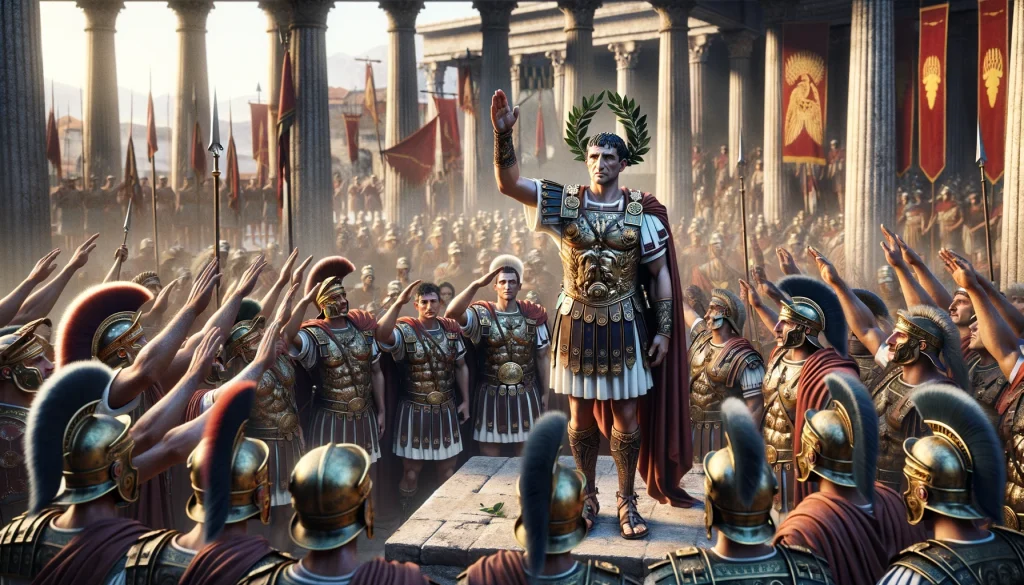 After his first important victory, his soldiers would usually hail him as Imperator or General-in-chief. The title was then officially confirmed by the Senate, if the victory added territories to the Republic. This occurred in Caesar’s case after his victory over the Helvetii in 58 B. C. Thereafter he was addressed as “Imperator” and wore the paludamentum, or cloak of reddish purple, a long flowing garment of fine wool, decorated with gold embroidery, perhaps fringed and easily distinguished.