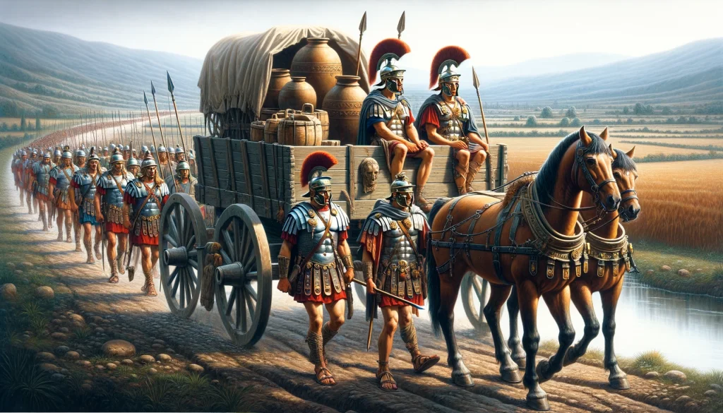 If we assume one pack mule and one tent for each squad (contubernium) of eight soldiers sleeping in that tent at night (two men being on guard) (contubernales, “bunkies”) a legion of 6,000 would have six hundred pack animals, beside private mounts and officers’ pack animals. There were also four-wheeled wagons (raedae) to carry forage and for use as ambulances for the sick and wounded.