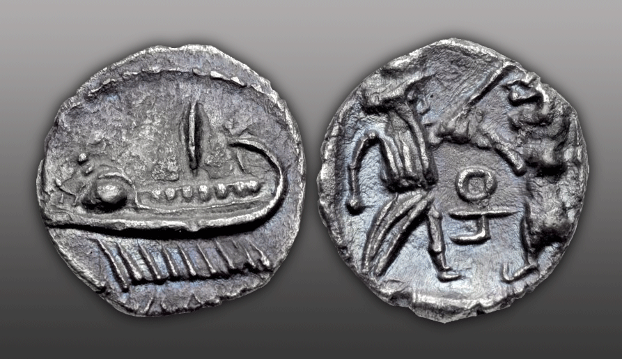 The above coin minted during the reign of Tennes, the king of Sidon, around 351/0 BC. The coin features an image of a Phoenician pentekonter sailing to the left, with waves depicted beneath it. The date of minting is indicated above the ship, though it appears faintly. On the other side, the coin shows the King of Persia standing to the right, gripping a lion by its mane.