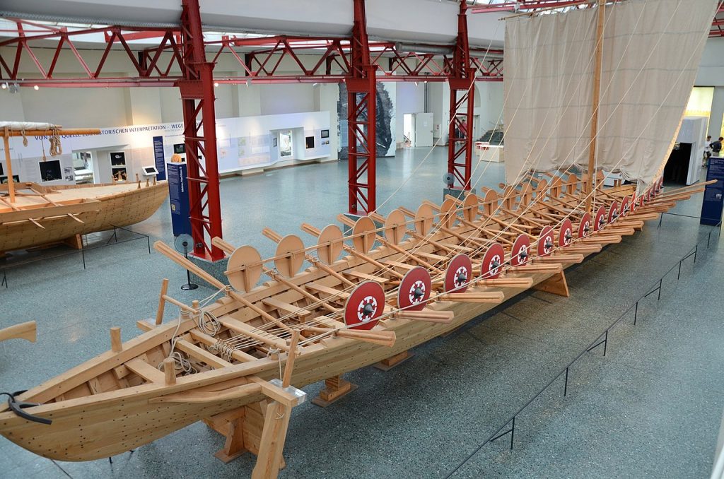 From the late 8th century the bireme was invented. The name bireme comes from “bi-” meaning two and “-reme” meaning oar. It was typically about 24 m long with a maximum beam width of around 3 m. This galley was developed by the Phoenicians and later adopted by the Greeks and Romans. It had a better propulsion system than the pentecontore. This improvement involved using a “apostis”, a type of outrigger or beam projecting from the side of the ship, to which the oar was attached. The lower row worked just as in the penteconter: The rowers were sitting towards the centre of the ship, and the oars fulcrum was fixed on the rail. The rowers on the upper bench were sitting more to the outside (so they didn’t interfere with the other row) and, to get a decent lever, their oars were fixed on the outrigger. Approximately 100 rowers were used, 25 per side in each of the two rows.