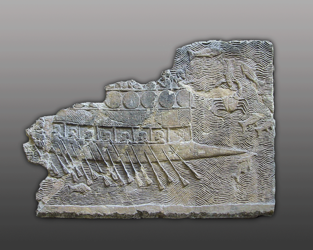 This Phoenician warship was depicted by Assyrians in their palace of Niniveh. It is a bireme, with two levels of oars. Shields are fastened around the superstructure, as on the fortifications of some city walls. The pointed bow is either a ram, for holding enemy ships, or a form of cutwater. Dated to 700-692 BC.