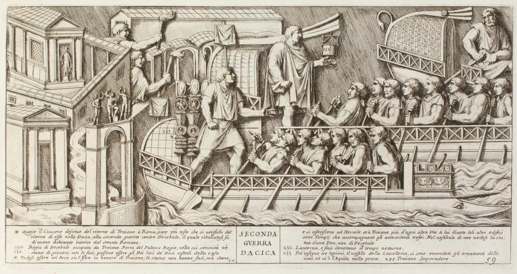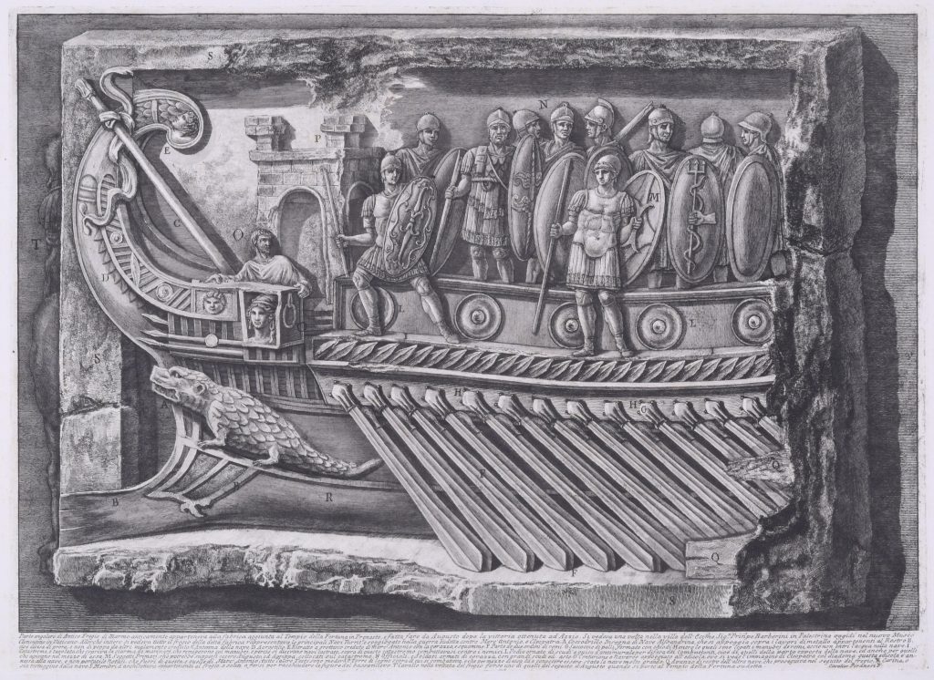 A drawing by Giovanni Battista Piranesi (1720-1778) of a Roman naval bireme depicted in a relief from the Temple of Fortuna Primigenia in Praeneste (Palastrina), which was built c. 120 BC; exhibited in the Pius-Clementine Museum in the Vatican Museums.