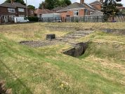 The vallum is a series of earthen ramparts and ditches (read more here) that runs roughly parallel south of the wall itself. At Benwell the vallum was diverted around the southern end of the fort, and the causeway was about 50 metres directly south of the fort’s southgate. The way in which the gate would have worked shows that it was closed from the north, indicating access was controlled from the fort.