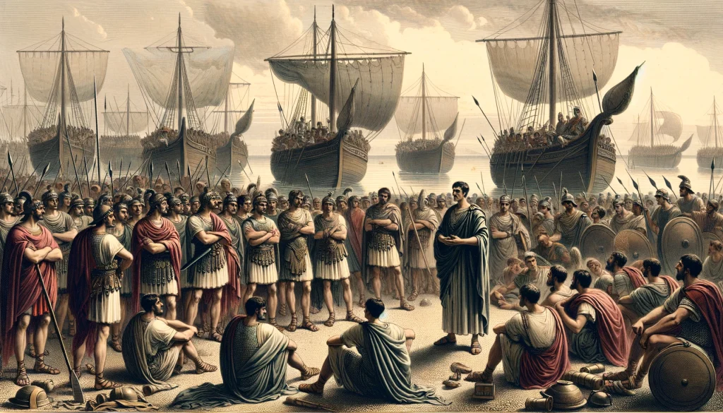 For reasons unclear, the supreme commander, Plautius, was unable to exert his authority, so he turned to Rome for help. This came in the form of Narcissus, a Freedman who used his position as correspondence secretary (ab epistulis) to the Roman emperor Claudius to become, in effect, a minister of state — the Secretary for State, and a close advisor to Claudius. Narcissus managed to persuade the troops into boarding. Because of his background, he was more on the same level with the troops and managed to get them to board the ships, even with their superstitions.